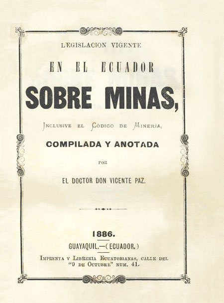 Paz, Vicente. 1886. Legislación vigente en el Ecuador sobre minas, inclusive el Código de Minería. Guayaquil, Ecuador : Imprenta y Librería Ecuatorianas.