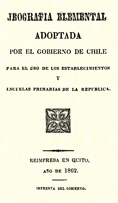 Gobierno de Chile. 1862. Jeografia elemental : adoptada por el gobierno de Chile para el uso de los establecimientos y Escuelas Primarias de la República. Quito, Ecuador : Imprenta del Gobierno.