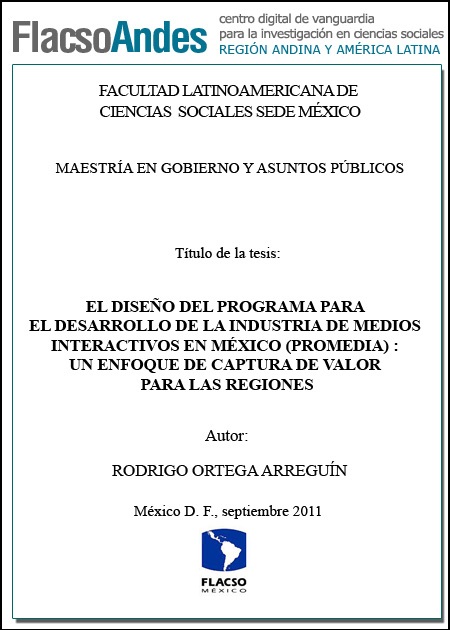 Ortega Arreguín, Rodrigo (2011). El diseño del programa para el desarrollo de la industria de medios interactivos en México (PROMEDIA) : un enfoque de captura de valor para las regiones. Maestría en Gobierno y Asuntos Públicos; FLACSO México. México. 98 h.