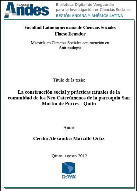 Marcillo Ortiz, Cecilia Alexandra. 2012. La construcción social y prácticas rituales de la comunidad de los Neo Catecúmenos de la parroquia San Martín de Porres - Quito. Tesis de maestría, Flacso Ecuador.