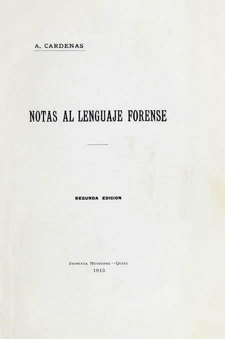 Cardenas, Alejandro. 1913. Notal al lenguaje forense. Segunda edición. Quito, Ecuador : Imprenta Municipal.