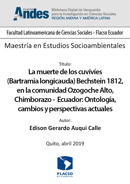 La presente tesis parte de un enfoque transdisciplinario que desde el multinaturalismo, el constructivismo y el postestructuralismo sustentados en las corrientes teóricas de la Ecología Política y la Antropología Ontológica, analiza con base en la ontología, la relación humano-naturaleza de los habitantes de la comunidad de Ozogoche Alto, ubicada en la provincia de Chimborazo, cantón Alausí. El principal objetivo de la presente investigación, fue el de analizar la ontología de la comunidad de Ozogoche Alto en relación a su vínculo con la naturaleza y de forma particular con el hecho de la muerte de los cuvivíes (Bartramia longicauda) en el complejo lacustre Ozogoche, Parque Nacional Sangay, Chimborazo-Ecuador, así como, los cambios que se han estructurado a lo largo de su historia como comunidad, debido a su relación con diversos factores exógenos.
