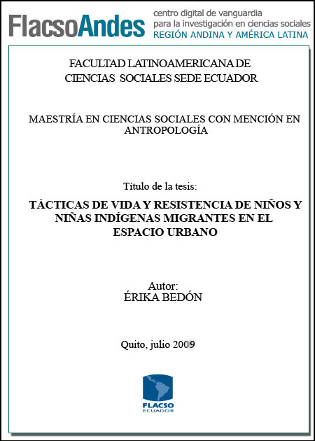 Bedón, Erika (2009). Tácticas de vida y resistencia de niños y niñas indígenas migrantes en el espacio urbano. Maestría en Ciencias Sociales con Mención en Antropología. FLACSO, Sede Ecuador. Quito. 117 p.