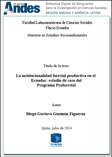 Guzmán Figueroa, Diego Gustavo. 2014. La institucionalidad forestal productiva en el Ecuador: estudio de caso del Programa Proforestal. Tesis de maestría, Flacso Ecuador.