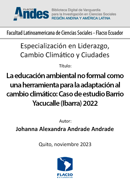 Andrade Andrade, Johanna Alexandra. 2023. La educación ambiental no formal como una herramienta para la adaptación al cambio climático: Caso de estudio Barrio Yacucalle (Ibarra) 2022. Tesina de especialización, Flacso Ecuador.