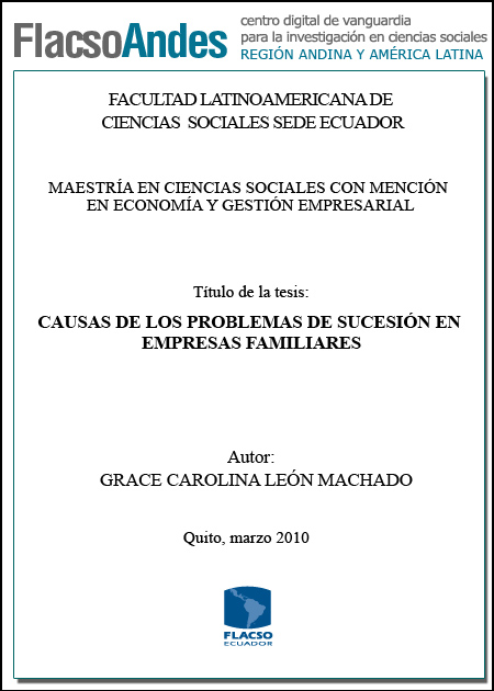León Machado, Grace Carolina (2010). Causas de los problemas de sucesión en empresas familiares. Maestría en Ciencias Sociales con mención en Economía y Gestión Empresarial, FLACSO sede Ecuador. Quito, 91 p.