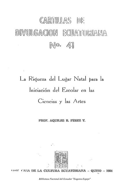 Aquiles Pérez, T. 1984. Cartilla de divulgación ecuatoriana No. 41. La Riqueza del lugar Natal para la Iniciación del Escolar en las Ciencias y las Artes. Quito, Ecuador : Casa de la Cultura Ecuatoriana.