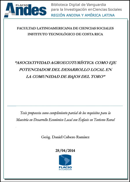 Cubero, G. D. (2014). Asociatividad agroecoturística como eje potenciador del desarrollo local en la Comunidad de Bajos del Toro (Tesis de Maestría en Desarrollo Económico Local con énfasis en Turismo Rural). FLACSO Sede Costa Rica, San José.