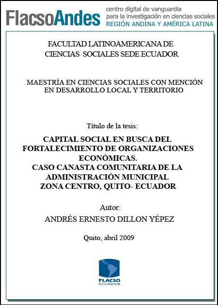 Dillon Yépez Andrés Ernesto (2009). Capital social: en busca del fortalecimiento de Organizaciones económicas, caso canasta comunitaria de la Administración municipal zona centro, Quito-Ecuador. Maestría en Políticas Públicas y Gestión, con mención en Desarrollo Local y Territorio; FLACSO sede Ecuador. Quito. 118 p.