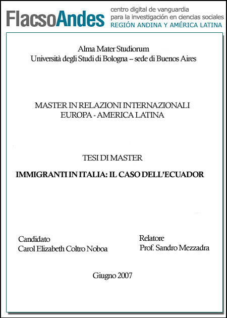 Coltro Noboa, Carol Elizabeth (2007). Immigranti in Italia : il caso dell' Ecuador. Master in Relazioni Internazionali; Università degli Studi di Bologna. Buenos Aires. 168 p.