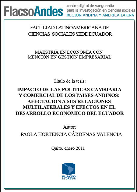 Cárdenas Valencia, Paola Hortencia (2011). Impacto de las políticas cambiaria y comercial de los países andinos : afectación a sus relaciones multilaterales y efectos en el desarrollo económico del Ecuador, Maestría en Economía con mención en Gestión Empresarial, FLACSO Sede Ecuador. Quito, [73] p.