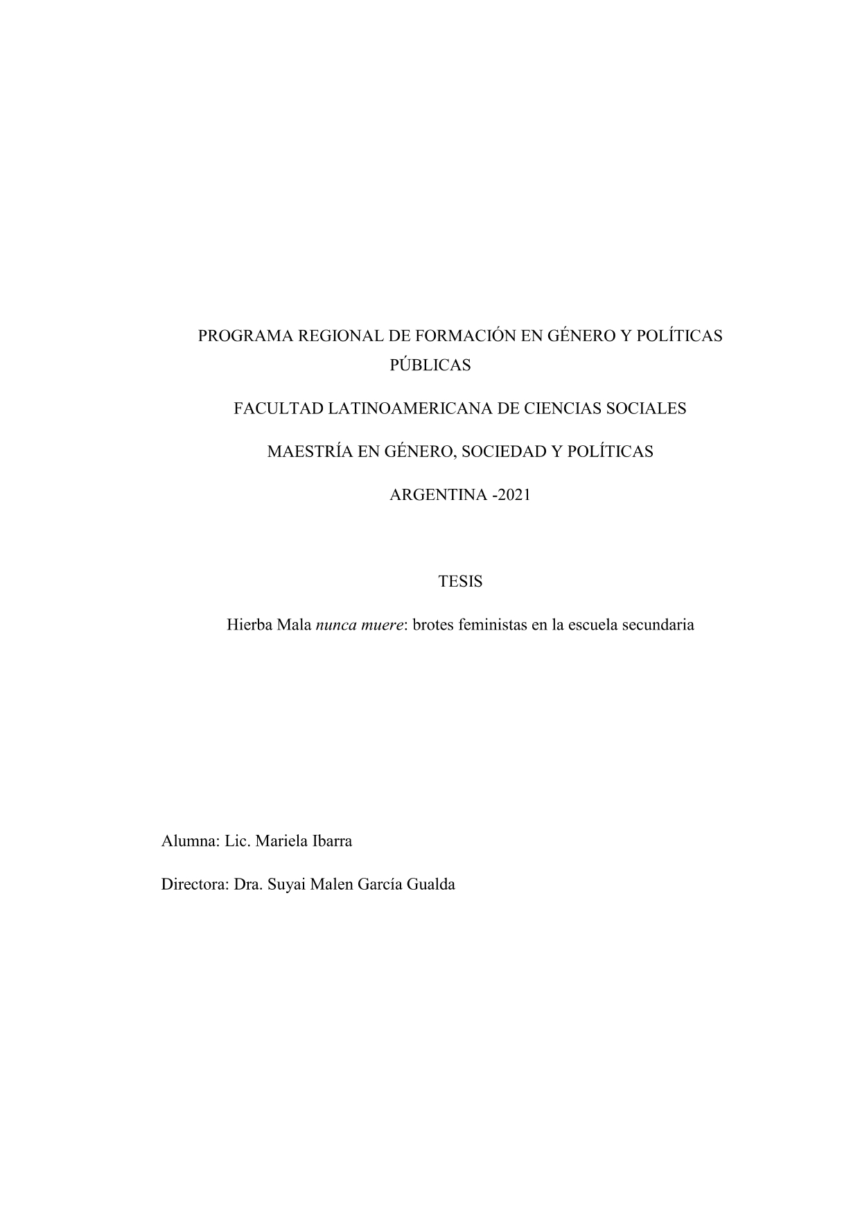 Ibarra, Mariela Judith (2021). Hierba Mala nunca muere : brotes feministas en la escuela secundaria. Tesis de Maestría. FLACSO. Sede Académica Argentina, Buenos Aires.