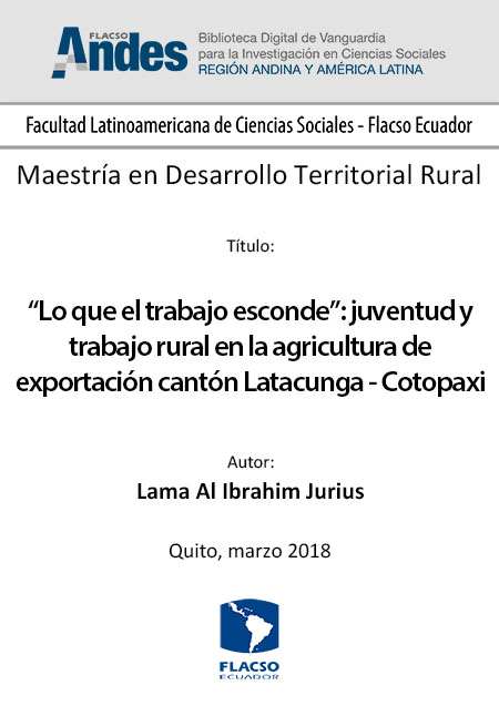 Al Ibrahim Jurius, Lama. 2018. "Lo que el trabajo esconde": juventud y trabajo rural en la agricultura de exportación cantón Latacunga - Cotopaxi. Tesis de maestría, Flacso Ecuador.