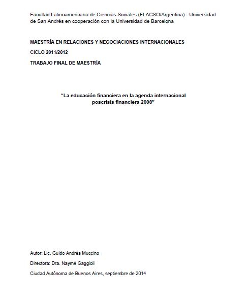 Muccino, Guido Andrés (2014). La educación financiera en la agenda internacional poscrisis financiera 2008. Tesis de Maestría. FLACSO. Sede Académica Argentina, Universidad de San Andrés, Universidad de Barcelona, Buenos Aires.