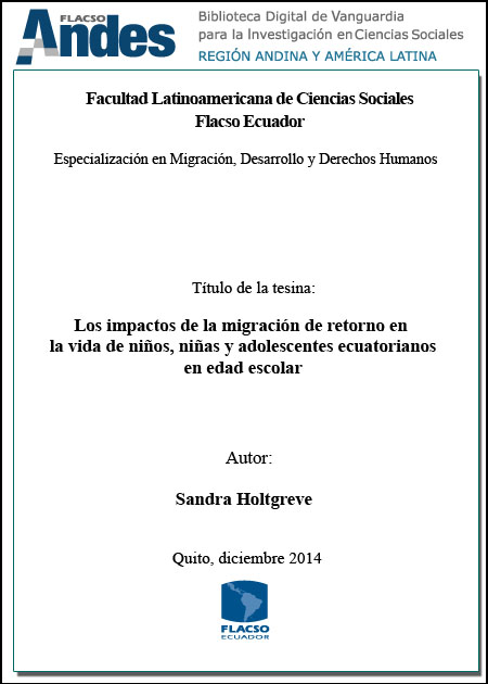 Holtgreve, Sandra. 2014. Los impactos de la migración de retorno en la vida de niños, niñas y adolescentes en edad escolar. Tesina de especialización, Flacso Ecuador.