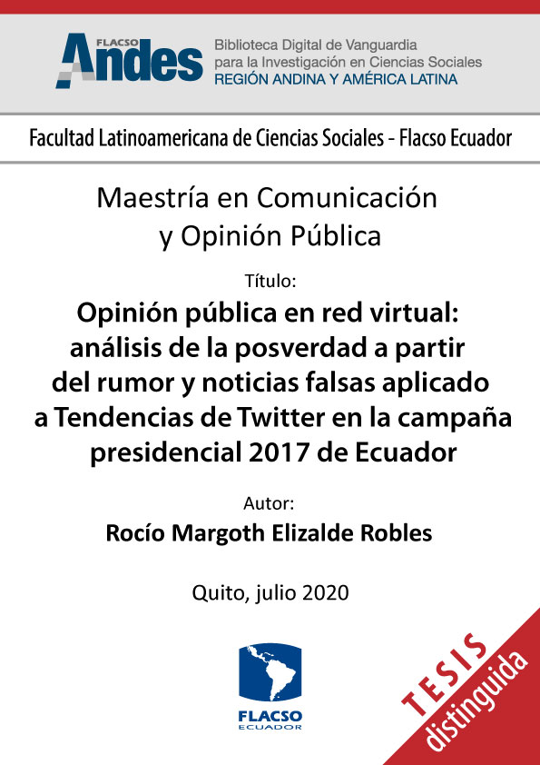 Elizalde Robles, Rocío Margoth. 2020. Opinión pública en red virtual: análisis de la posverdad a partir del rumor y noticias falsas aplicado a Tendencias de Twitter en la campaña presidencial 2017 de Ecuador. Tesis de maestría, Flacso Ecuador.