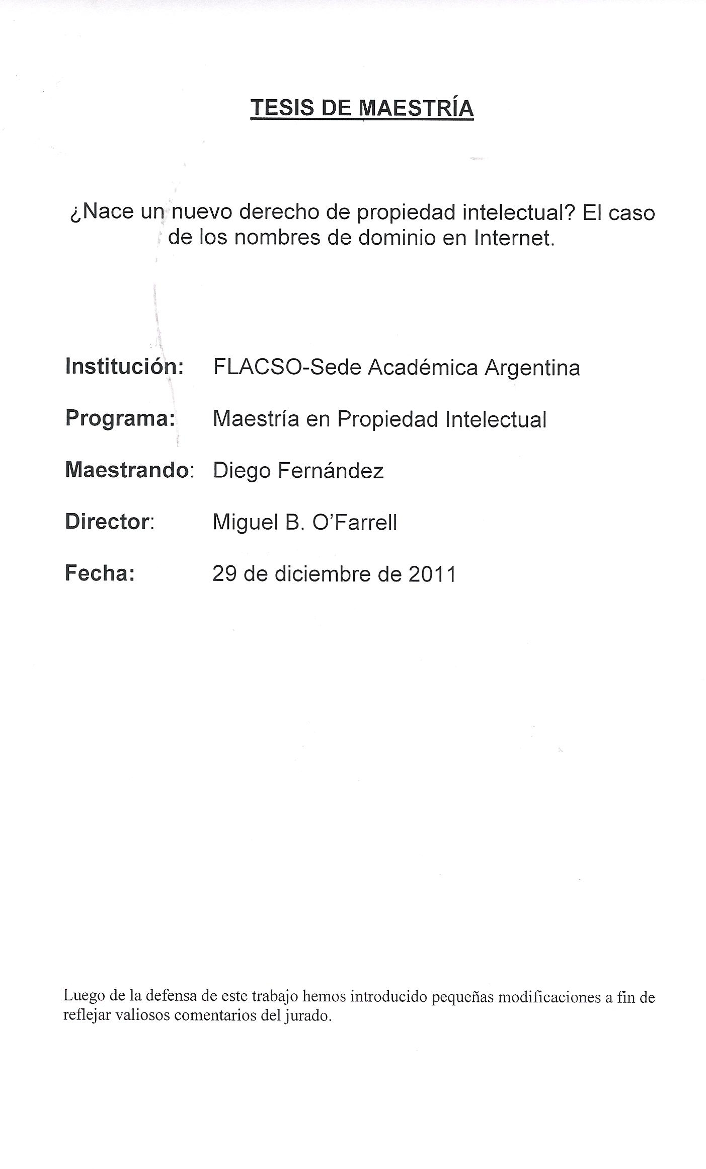 Fernández, Diego (2012) ¿Nace un nuevo derecho de propiedad intelectual? : el caso de los nombres de dominios de internet. Tesis de Maestría. FLACSO. Sede Académica Argentina, Buenos Aires.