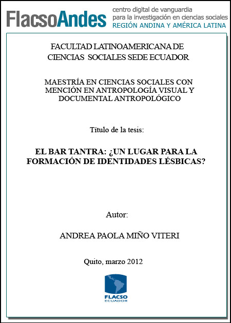 Miño Viteri, Andrea Paola (2012). El bar Tantra : ¿Un lugar para la formación de identidades lésbicas?. Maestría en Ciencias Sociales con mención en Antropología Visual y Documental Antropológico; FLACSO - Sede Ecuador. Quito. 111 p.