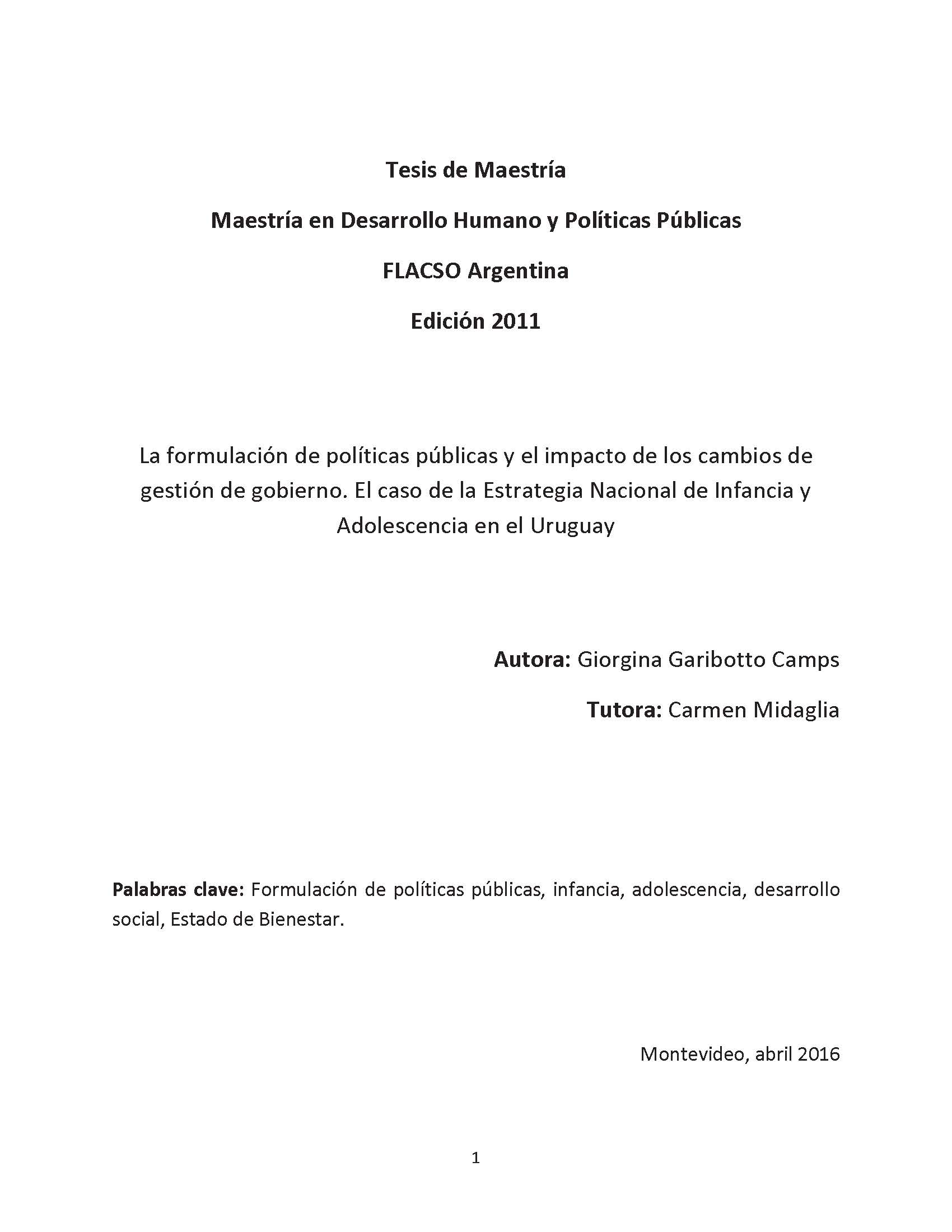 Garibotto Camps, Giorgina (2016). La formulación de políticas públicas y el impacto de los cambios de gestión de gobierno : el caso de la Estrategia Nacional de Infancia y Adolescencia en el Uruguay. Tesis de Maestría. FLACSO. Sede Académica Argentina, Buenos Aires.