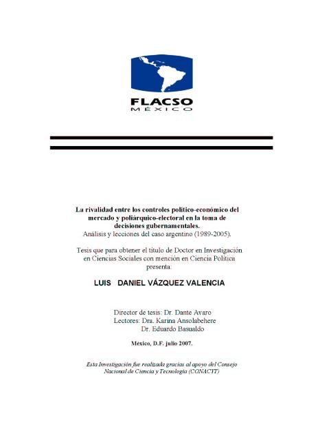 Vázquez Valencia, Luis Daniel (2007). La rivalidad entre los controles político-económico del mercado y poliárquico-electoral en la toma de decisiones gubernamentales : análisis y lecciones del caso argentino, 1989-2005. Doctorado de Investigación en Ciencias Sociales con Mención en Ciencia Política; FLACSO - Sede Académica de México. México. 411 p.