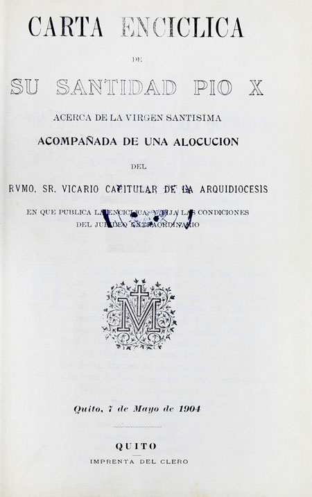 Pérez Quiñones, Ulpiano. 1904. Carta encíclica de su Santidad Pío X acerca de la Virgen Santísima acompañada de una alocución del Rvmo. Sr. Vicario Capitular de la Arquidiócesis en que publica la encíclica, y fija las condiciones del jubileo extraordinario. Quito, Ecuador : Imprenta del Clero.