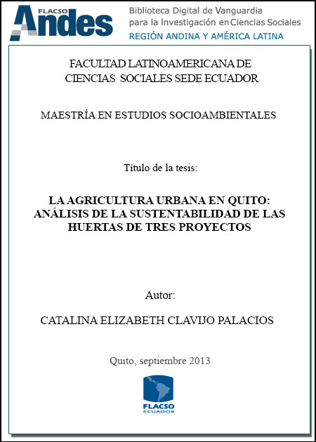 Clavijo Palacios, Catalina Elizabeth. 2013. La agricultura urbana en Quito: análisis de la sustentabilidad de las huertas de tres proyectos. Tesis de maestría, Flacso sede Ecuador.