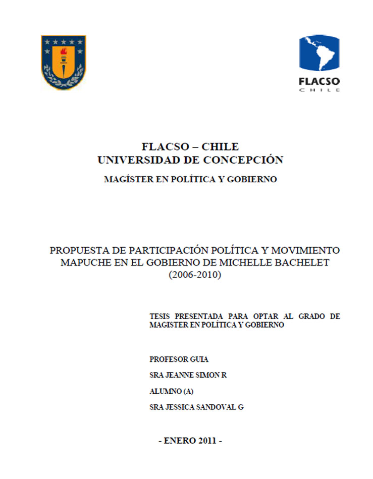 Sandoval Garcés, Jessica Pamela. 2011. Propuestas de participación política y movimiento mapuche en el gobierno de Michelle Bachelet. Tesis de Maestría, FLACSO Chile y Universidad de Concepción.