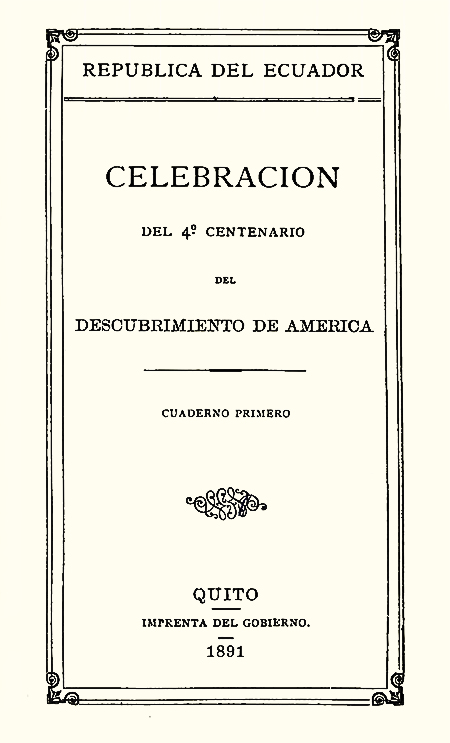 Pallares Arteta, Leonidas. 1891. República del Ecuador, celebración del 4° centenario del descubrimiento de América, cuaderno primero. Quito, Ecuador : Imprenta del Gobierno.