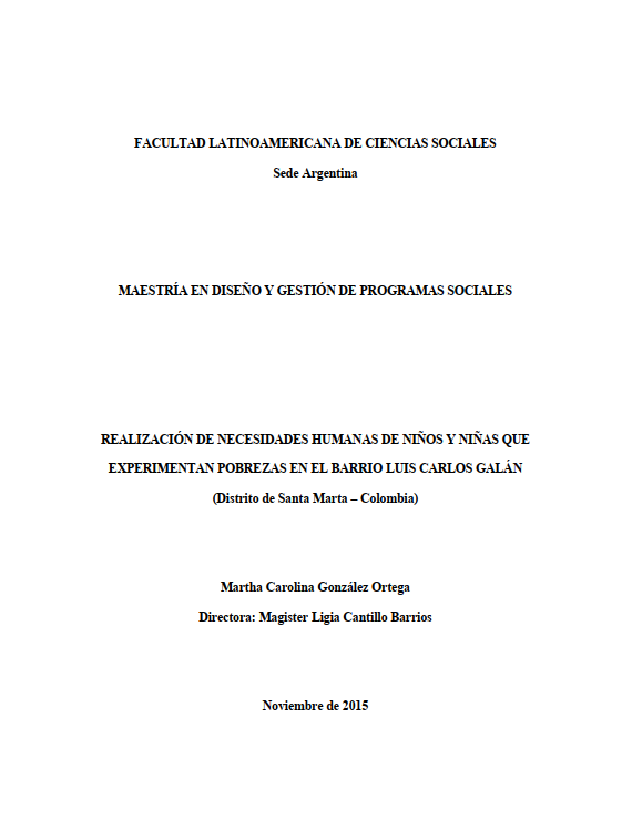 González Ortega, Martha Carolina (2016). Realización de necesidades humanas de niños y niñas que experimentan pobrezas en el barrio Luis Carlos Galán: distrito de Santa Marta, Colombia. Tesis de Maestría. FLACSO. Sede Académica Argentina, Buenos Aires.
