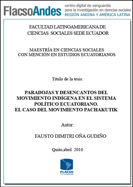 Oña Gudiño, Fausto Dimitri (2010). Paradojas y desencantos del movimiento indígena en el sistema político ecuatoriano: el caso del movimiento Pachakutik. Maestría en Ciencias Sociales con mención en Estudios Ecuatorianos; FLACSO sede Ecuador. Quito. 79 p.