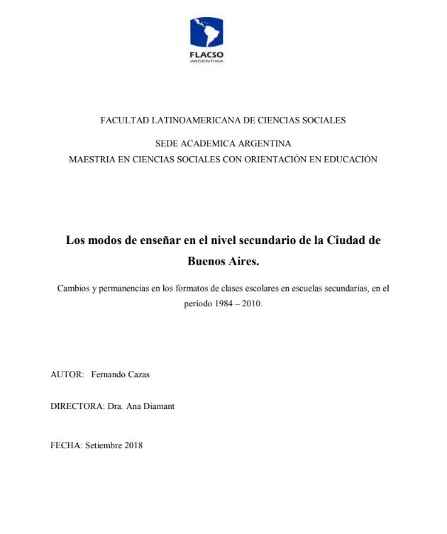 Cazas, Fernando José (2018). Los modos de enseñar en el nivel secundario de la Ciudad de Buenos Aires : cambios y permanencias en los formatos de clases escolares en escuelas secundarias, en el período 1984-2010. Tesis de Maestría. FLACSO. Sede Académica Argentina, Buenos Aires.