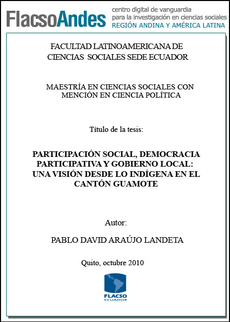Araújo Landeta, Pablo David (2010). Participación social, democracia participativa y gobierno local : una visión desde lo indígena en el Cantón Guamote. Maestría en Ciencias Sociales con mención en Ciencia Política; FLACSO - Sede Ecuador. Quito. 103 p.