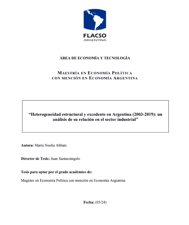 Abbate, María Noelia (2024). Heterogeneidad estructural y excedente en Argentina (2003-2019): un análisis de su relación en el sector industrial. Tesis de Maestría. FLACSO. Sede Académica Argentina, Buenos Aires.