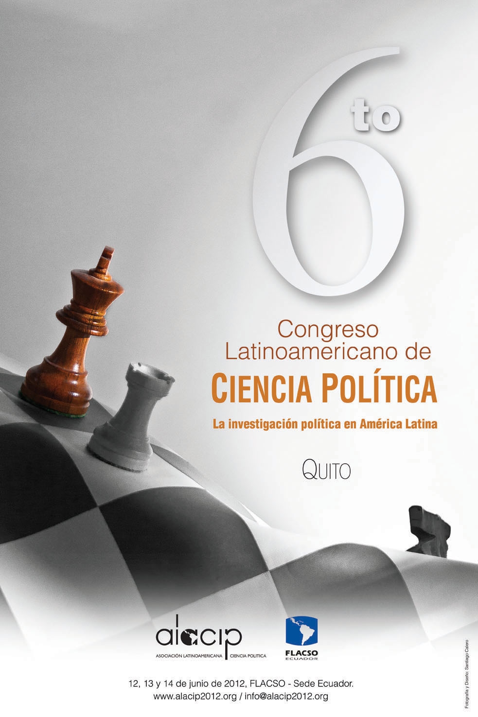 Afiche promocional del 6º Congreso Latinoamericano de Ciencia Política. La investigación política en América Latina, realizado del 12 al 14 de junio de 2012 en Flacso sede Ecuador, con la colaboración de Asociación Latinoamericana de Ciencia Política (ALACIP).