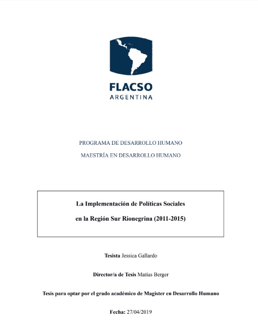 Gallardo, Jessica Mariana (2019). La implementación de políticas sociales en la región sur rionegrina : 2011-2015. FLACSO. Sede Académica Argentina, Buenos Aires.