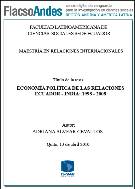 Alvear Cevallos, Adriana (2010). Economía política de las relaciones Ecuador India: 1998-2008. Maestría en Relaciones Internacionales; FLACSO sede Ecuador. Quito. 76 p.