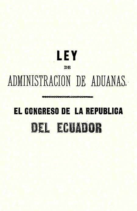 [1887]. Ley de administración de aduanas. El Congreso de la República del Ecuador. [ Quito, Ecuador ] : [ Editorial sin identificar ].