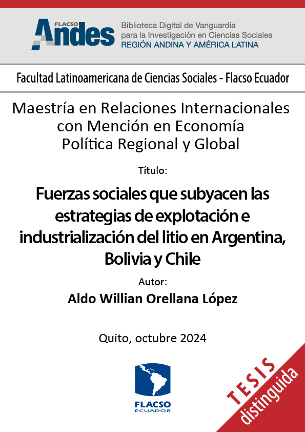 Orellana López, Aldo Willian. 2024. Fuerzas sociales que subyacen las estrategias de explotación e industrialización del litio en Argentina, Bolivia y Chile. Tesis de maestría, Flacso Ecuador.