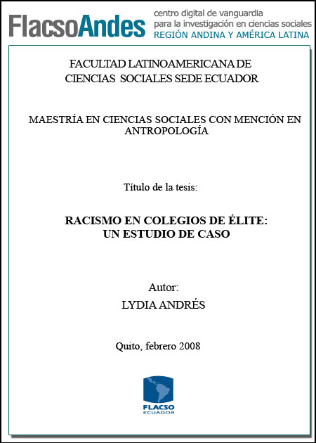 Andrés, Lydia (2008). Racismo en colegios de élite: un estudio de caso. Maestría en Ciencias Sociales con mención en Antropología; FLACSO sede Ecuador. Quito. 146 p.