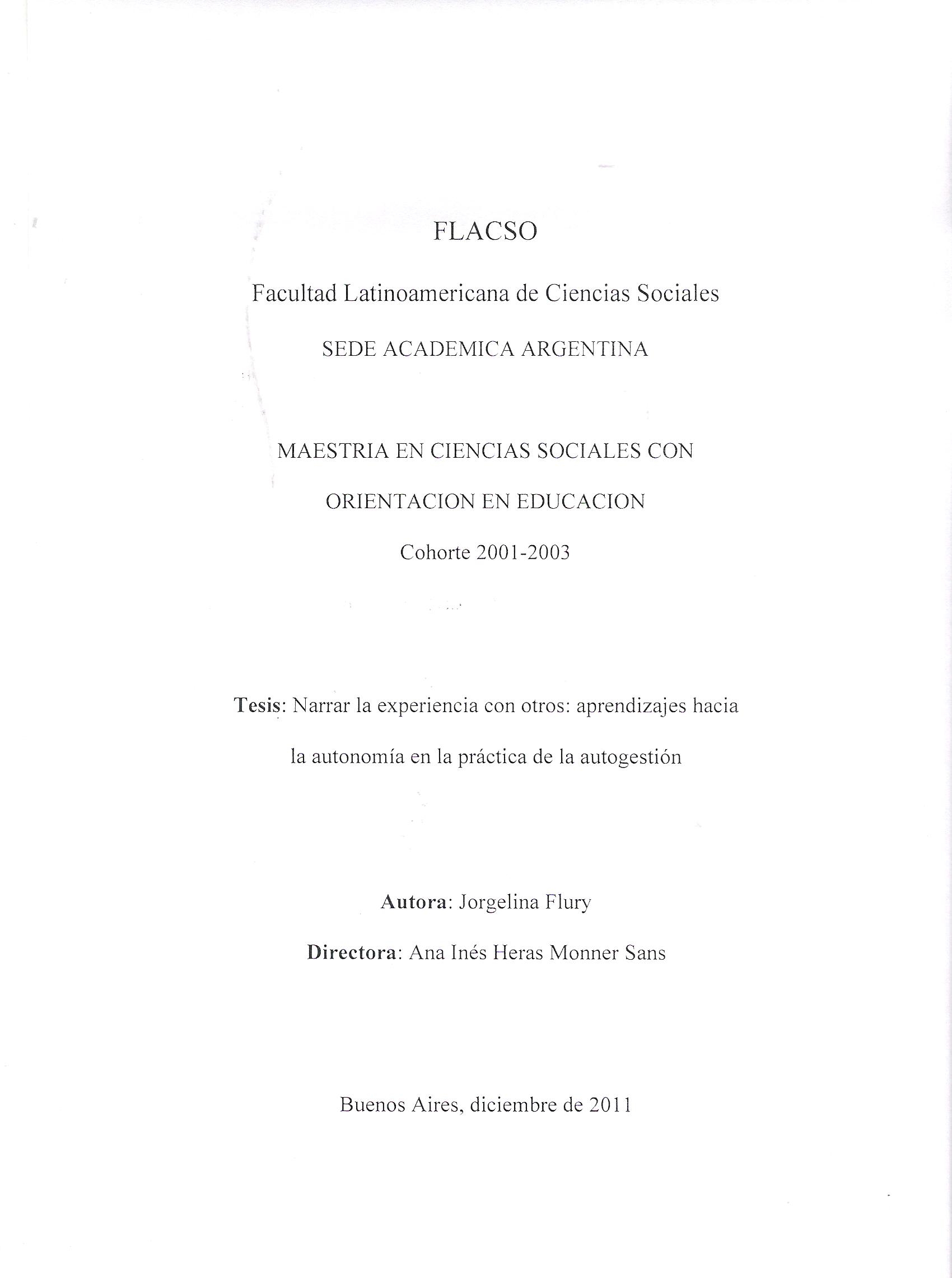 Flury, Jorgelina (2012). Narrar la experiencia con otros : aprendizaje hacia la autonomía en la práctica de la autogestión. Tesis de Maestría. FLACSO. Sede Académica Argentina, Buenos Aires.