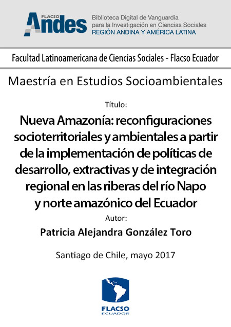 González Toro, Patricia Alejandra. 2017. Nueva Amazonía: reconfiguraciones socioterritoriales y ambientales a partir de la implementación de políticas de desarrollo, extractivas y de integración regional en las riberas del río Napo y norte amazónico del Ecuador. Tesis de maestría, Flacso Ecuador.