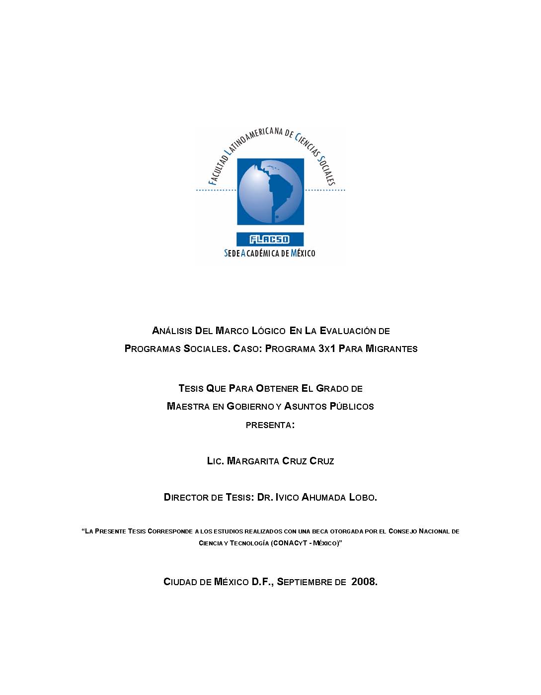 Cruz Cruz, Margarita (2008). Análisis del marco lógico en la evaluación de programas sociales : caso : programa 3x1 para migrantes. Maestría en Gobierno y Asuntos Públicos; FLACSO - Sede Académica de México. México. 100 h.