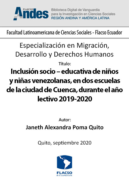 Poma Quito, Janeth Alexandra. 2020. Inclusión socio – educativa de niños y niñas venezolanas, en dos escuelas de la ciudad de Cuenca, durante el año lectivo 2019-2020. Tesina de especialización, Flacso Ecuador.