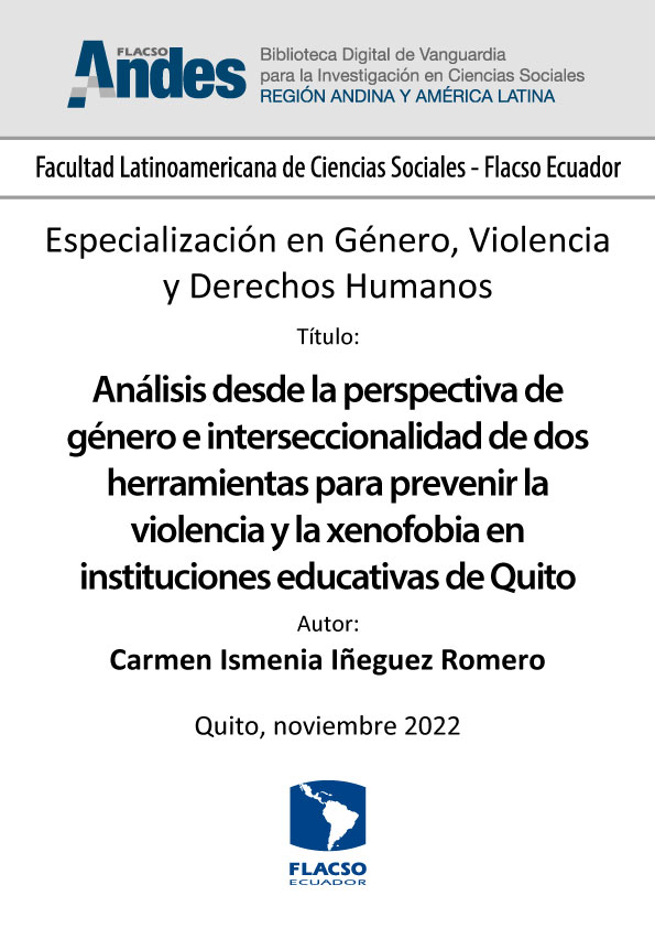 Iñiguez Romero, Carmen Ismenia. 2022. Análisis desde la perspectiva de género e interseccionalidad de dos herramientas para prevenir la violencia y la xenofobia en instituciones educativas de Quito. Tesina de especialización, Flacso Ecuador.