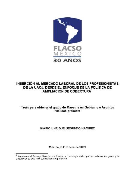 Segundo Ramírez, Mario Enrique (2009). Inserción al mercado laboral de los profesionistas de la UACJ : desde el enfoque de la política de ampliación de cobertura. Maestría en Gobierno y Asuntos Públicos; FLACSO - Sede Académica de México. México. 156 h.