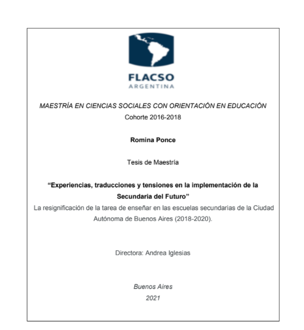 Ponce, Romina Belén. (2021). Experiencias, traducciones y tensiones en la implementación de la secundaria del futuro : la resignificación de la tarea de enseñar en las escuelas secundarias de la Ciudad Autónoma de Buenos Aires (2018-2020). Tesis de Maestría. FLACSO. Sede Académica Argentina, Buenos Aires.