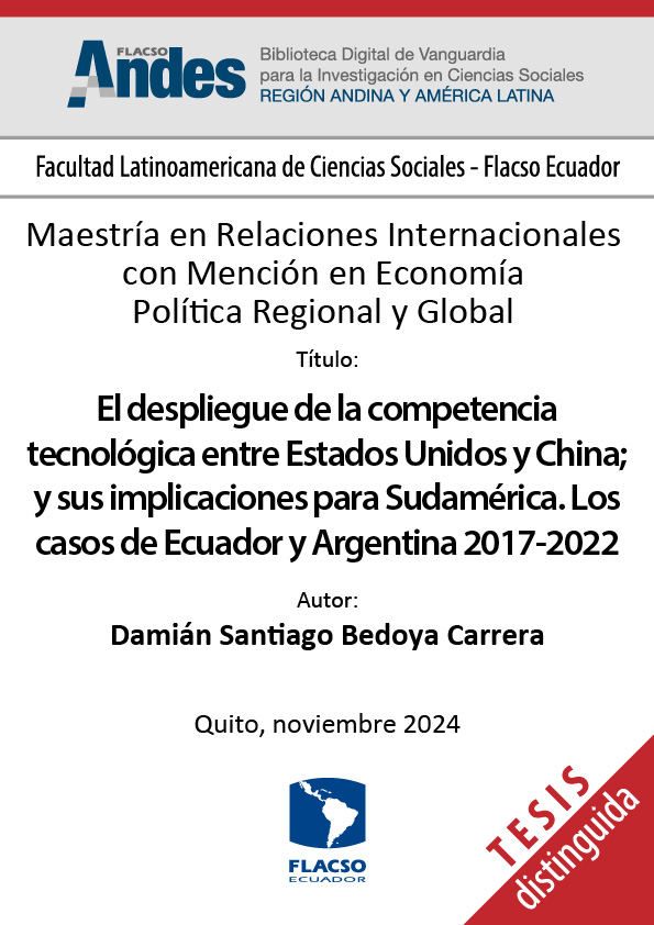 Bedoya Carrera, Damián Santiago. 2024. El despliegue de la competencia tecnológica entre Estados Unidos y China; y sus implicaciones para Sudamérica. Los casos de Ecuador y Argentina 2017-2022. Tesis de maestría, Flacso Ecuador.