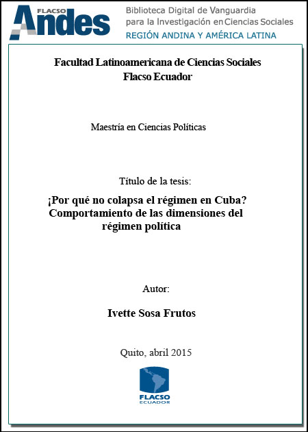 Sosa Frutos, Ivette. 2015. ¿Por qué no colapsa el régimen en Cuba? Comportamiento de las dimensiones del régimen político. FLACSO Sede Ecuador, Quito.