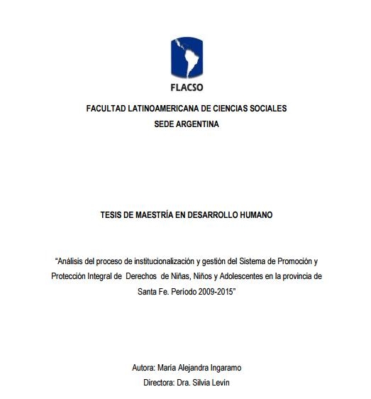 Ingaramo, María Alejandra (2016). Análisis del proceso de institucionalización y gestión del Sistema de Promoción y Protección Integral de Derechos de Niñas, Niños y Adolescentes en la provincia de Santa Fe : período 2009-2015. Tesis de Maestría. FLACSO. Sede Académica Argentina, Buenos Aires.