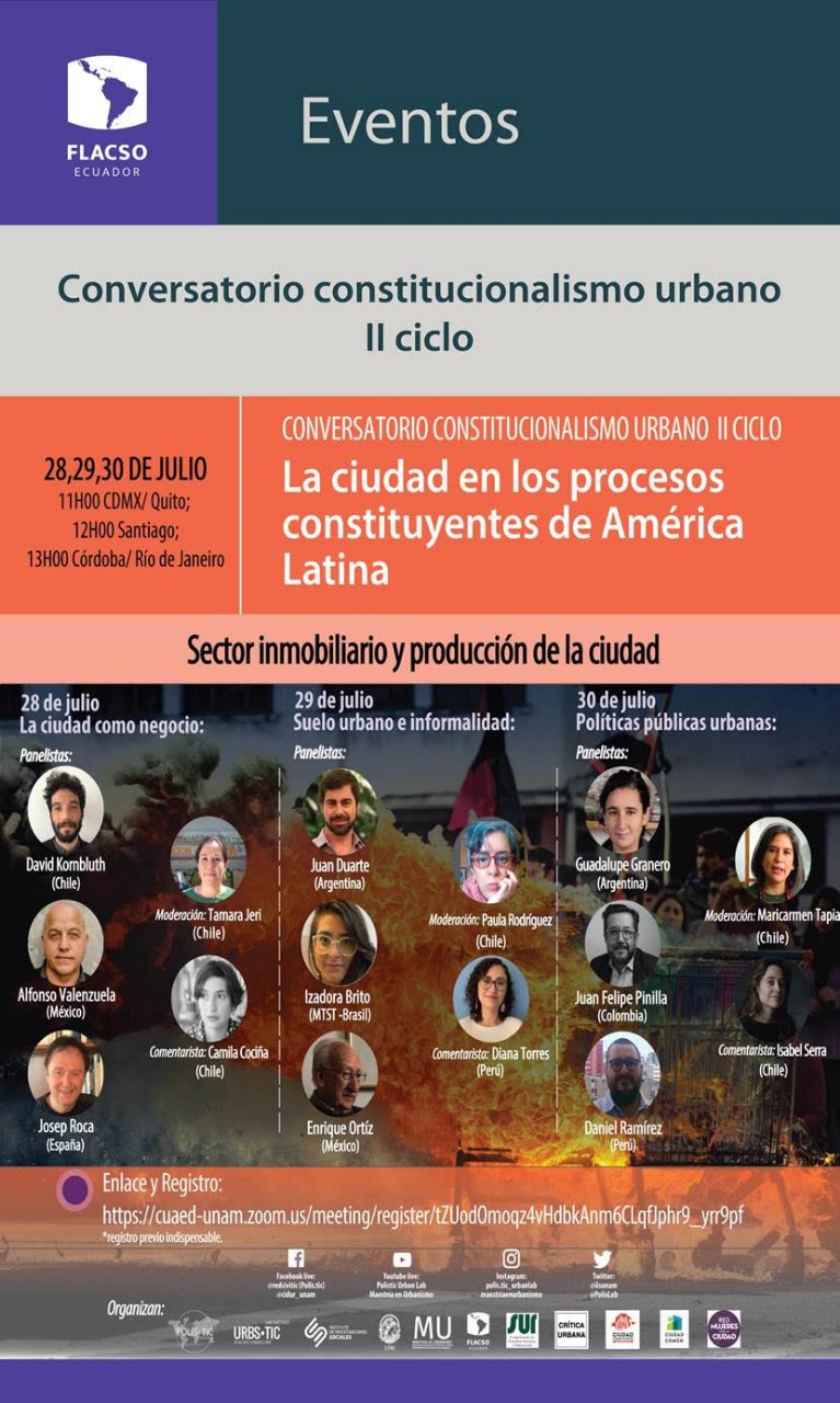 FLACSO Ecuador invita al Conversatorio constitucionalismo urbano II ciclo: La ciudad en los procesos constituyentes de América Latina. Sector inmobiliario y producción de la ciudad. Suelo urbano e informalidad, el 29 de julio de 2021- 11h00 : FLACSO Ecuador, Quito.